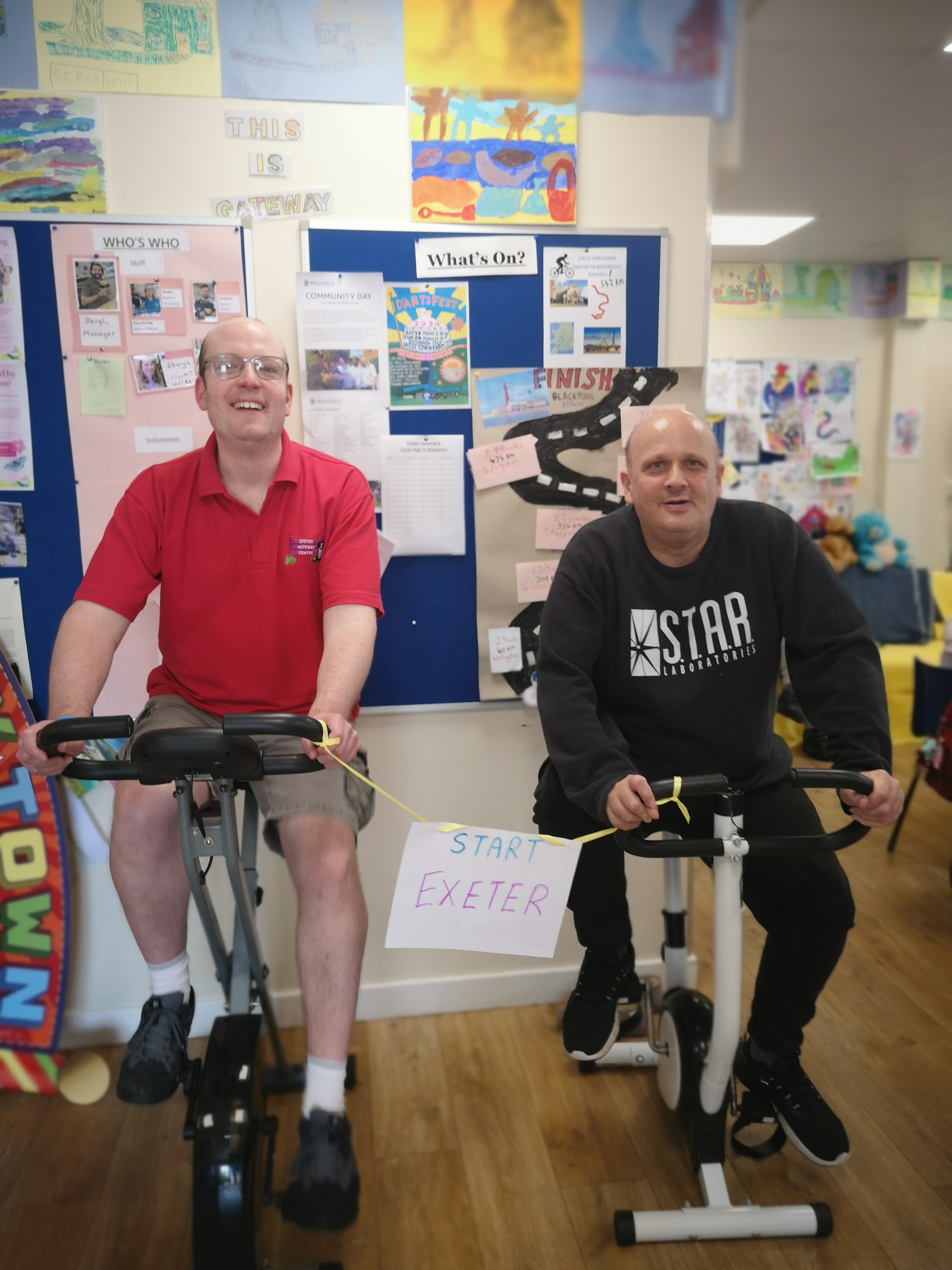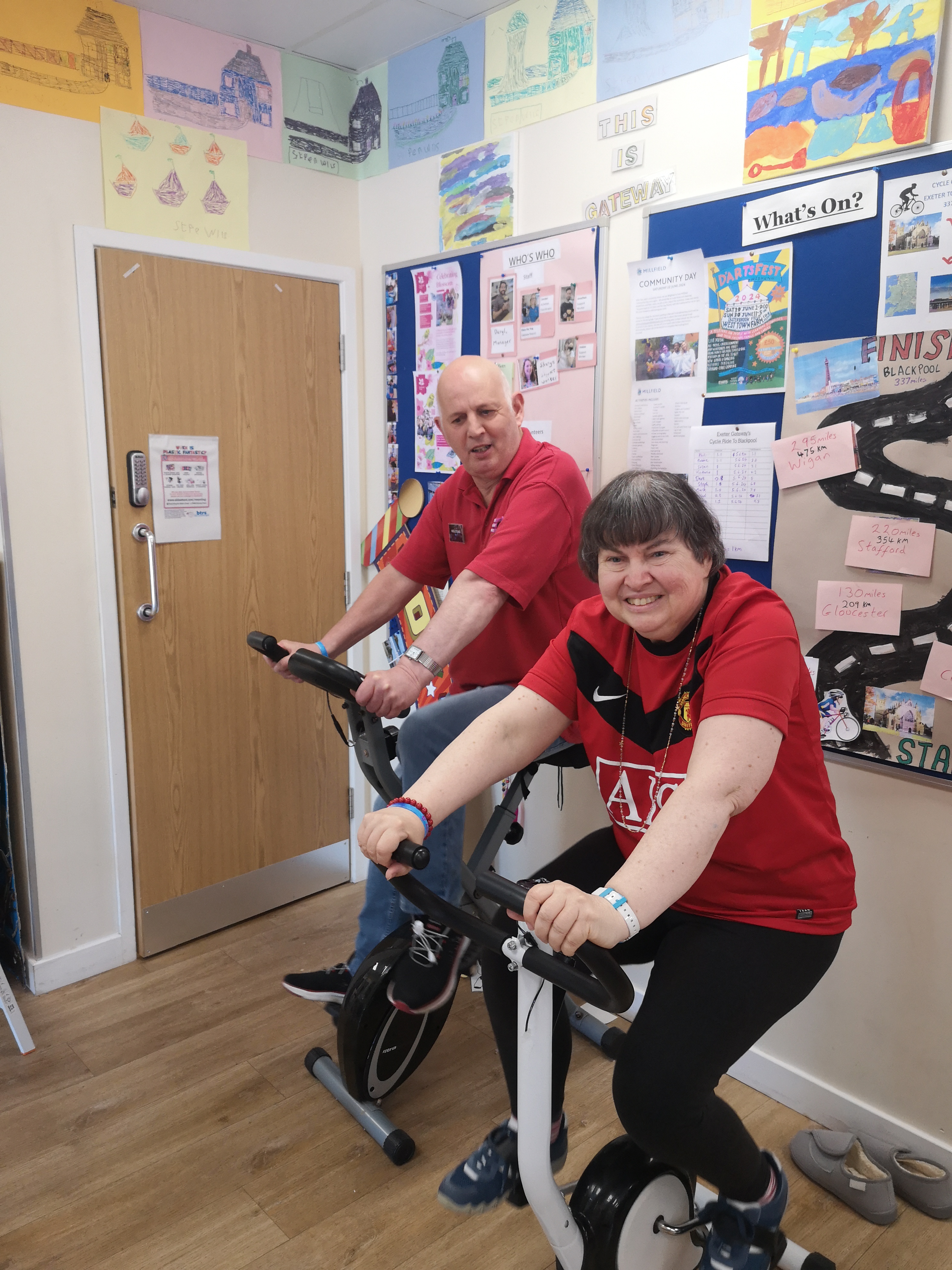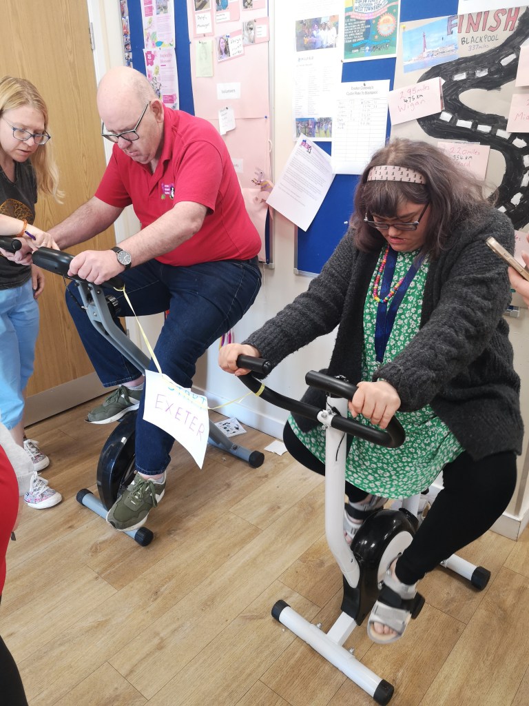 We have two exercise bikes, and plan to finish the ride by the end of July. The members are very keen to get the miles/kms covered! We hope to raise £500 (split equally)-we have a JustGiving Page or donations can be given to the centre.